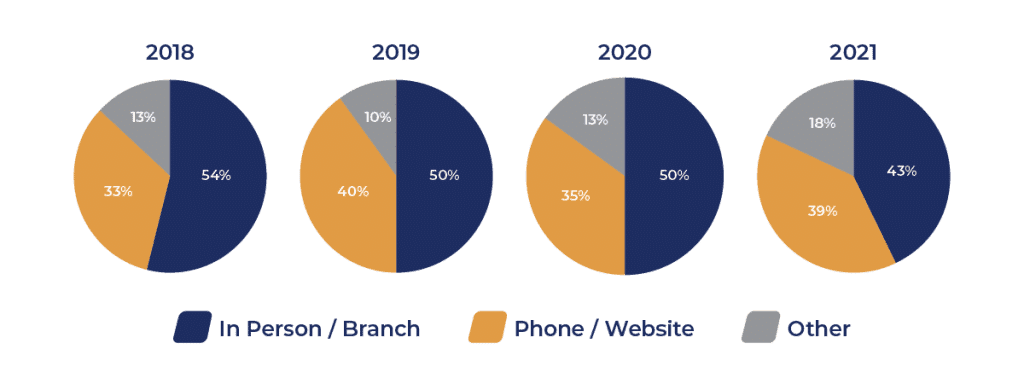 There has been a steady decline of people seeking in-branch financial advice from traditional banks, from 54% in 2018 to 43% in 2021. During that same time period, there was an increase in the percentage of people seeking financial advice via phone and online websites which were hosted by traditional financial institutions. This trend will continue to accelerate with further branch closures and a growing number of consumers seeking digital solutions.